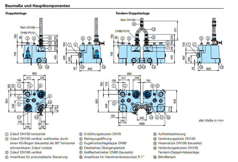 Das Produkt besteht aus einer anschlussfertigen HOMA Sanistar Plus 335 D Abwasser-Doppelhebeanlage mit einem 300 Liter Sammelbehälter, elektronischer Steuerung und zwei Pumpen. Der Sammelbehälter besteht aus einem unverrottbaren, gas- und geruchsdichter Kunststoff-Behälter (PE). Die Zuläufe haben die folgende Maße: 1xDN150 horizontal 300mm Zulaufhöhe, 1xDN150 vertikal 400mm Zulaufhöhe mit 90°- Formstück (bauseits) als horizontaler Zulauf 600mm oder höher horizontal schwenkbar, 1xDN100 vertikal, 700mm Zulaufhöhe, 2xDN150 Verbindungsstutzen für Behälter in Tandemaufstellung. Druckanschluss: Flansch DN80. Elastisches Übergangsstück DN80/DN100. Im Druckanschluss integrierte weichdichtende Kugel-Rückschlagklappe. Entlüftungsstutzen: DN70 vertikal. Anschluß für Handmembranpumpe R1″ IG. Reinigungsöffnung mit Schraubdeckel.